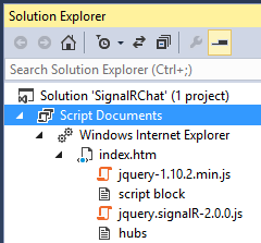 In Solution Explorer, inspect the Script Documents node for the running application. There is a script file named hubs that the SignalR library dynamically generates at runtime. This file manages the communication between jQuery script and server-side code.