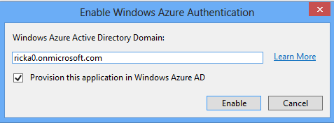 - Enter the domain for your Windows Azure Active Directory tenant (for example, contoso.onmicrosoft.com) and click Enable: