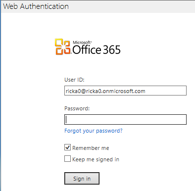 - In the Web Authentication dialog sign in as an administrator for your Windows Azure Active Directory tenant: