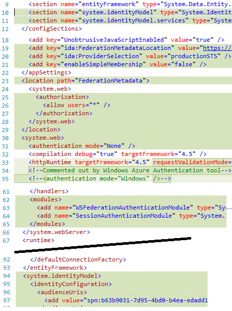 System.IdentityModel.Tokens.ValidatingIssuerNameRegistryis added to your project. Windows Identity Foundation settings in your application will be configured to accept security tokens from your Windows Azure Active Directory tenant. Click on the image below to see an expanded view of the changes made to the Web.config file.