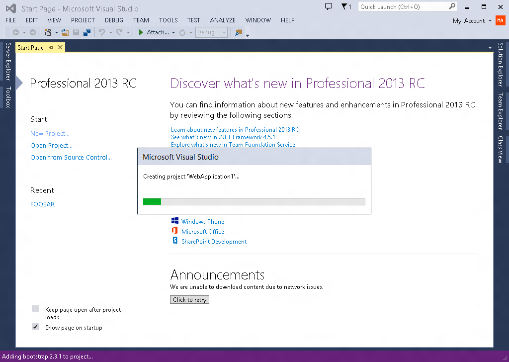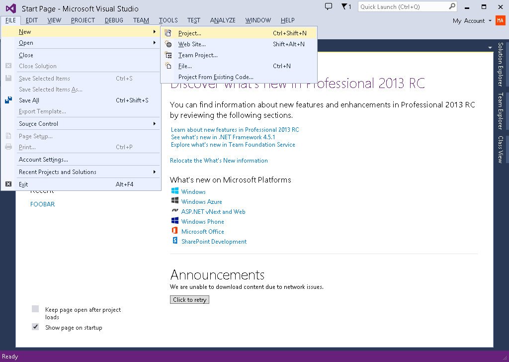 Start Visual Studio 2013 select New Project from the Start page. Or, from the File menu, select New and then Project.