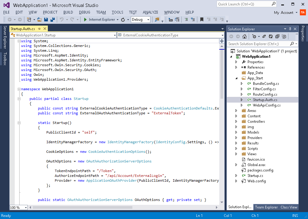 When Visual Studio 2013 has finished creating your project, open the Startup.Auth.cs file that is located in the App_Start folder.
