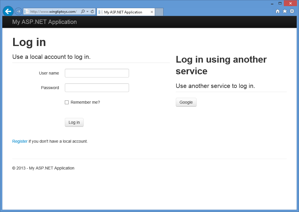 The examples in this walkthrough will demonstrate how to configure each of the supported external authentication services by using the new ASP.NET Web Application template that ships with Visual Studio 2013.