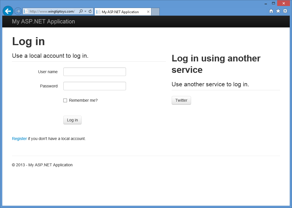 13:14: //app.UseGoogleAuthentication();When you press F5 to open your web application in your web browser, you will see that Twitter has been defined as an external authentication service: