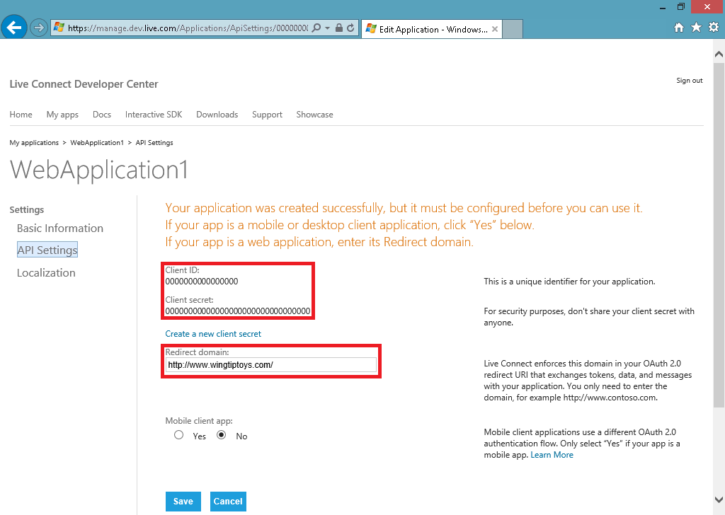 On the API Settings page for your application, enter the redirect domain for your application and copy the Client ID and Client secret for your project, and then click Save: