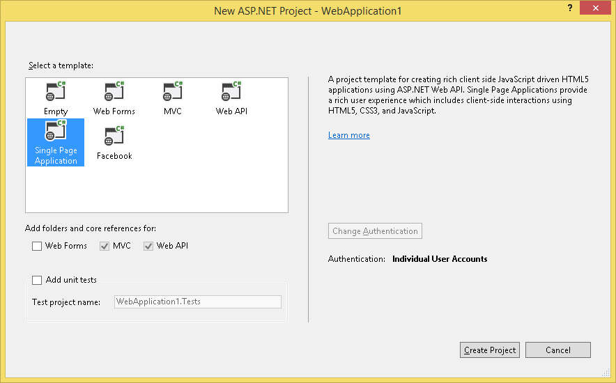 When the New ASP.NET Project is displayed, select the SPA template and click Create Project.