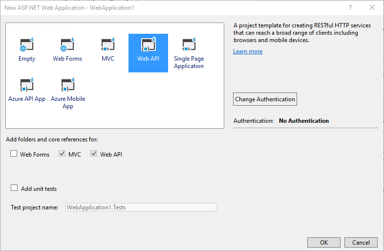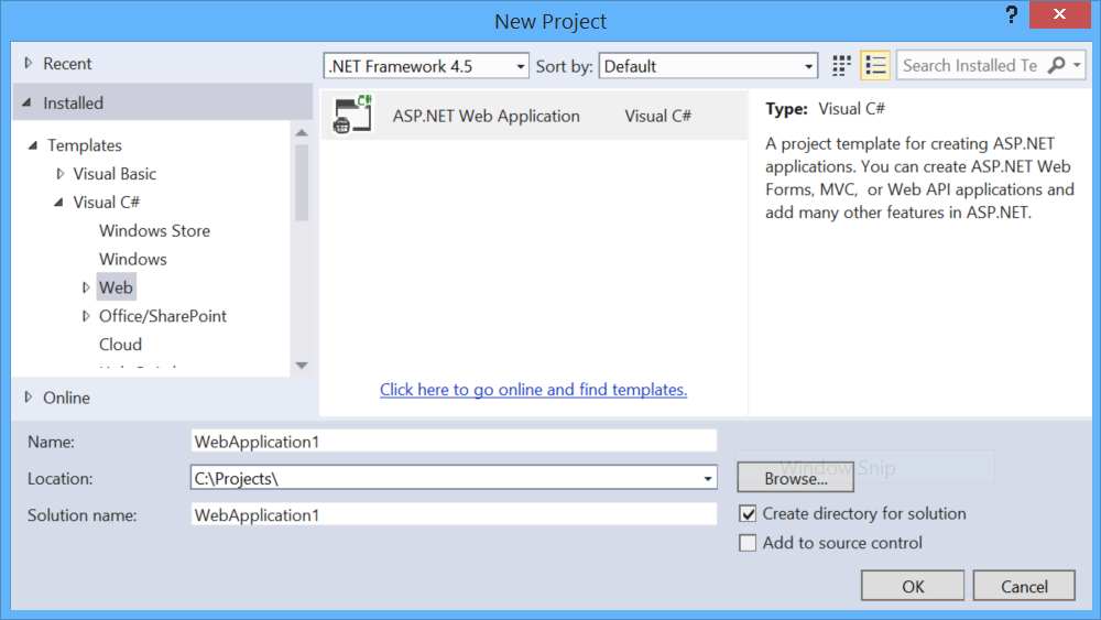 First, we’ll create a new ASP.NET Web Application project. In Visual Studio, from the File menu, select New, then Project. Under Templates, Web, select ASP.NET Web Application.