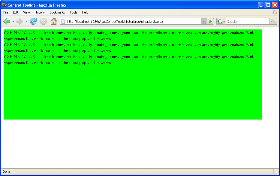 Then, add the AnimationExtender to the page, providing an ID, the TargetControlID attribute and the obligatory runat="server":