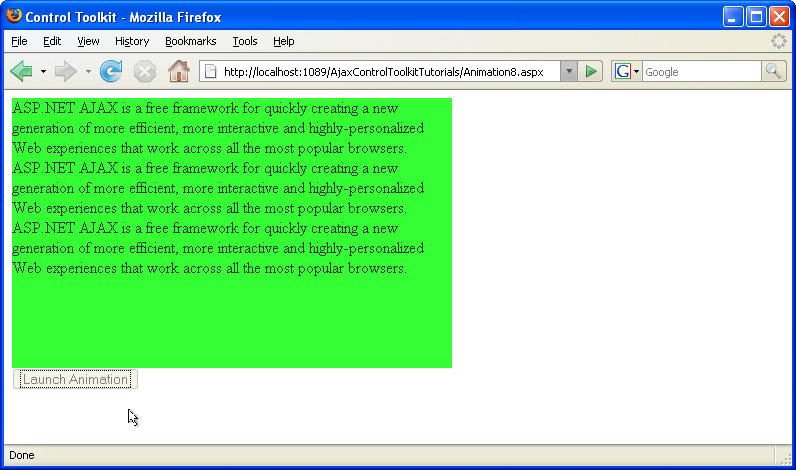 The Animation control in the ASP.NET AJAX Control Toolkit is not just a control but a whole framework to add animations to a control. Generally, launching an animation is triggered by user interaction with the same control. It is however also possible to interact with one control and then animation another control.