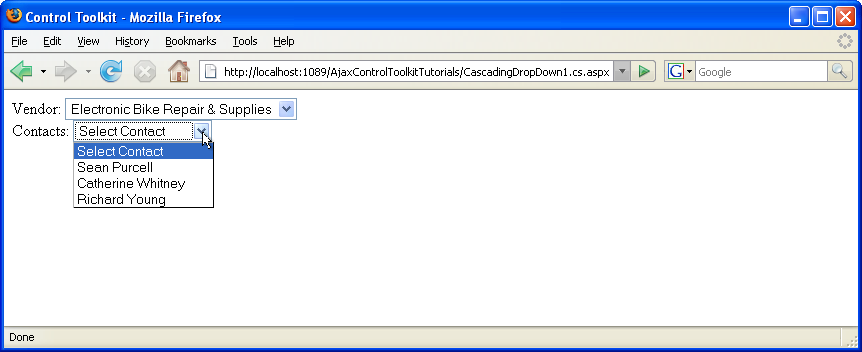 Then, two CascadingDropDown extenders must be added to the page. One fills the first (vendors) list, and the other one fills the second (contacts) list. The following attributes must be set: