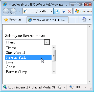 After you complete the steps above, the ComboBox is bound to a SqlDataSource control that represents the movies from the Movies database table. The source for the page looks like Listing 2 (I cleaned up the formatting a little bit).