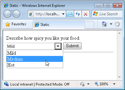 We�ll use the ComboBox control to display a static list of choices. The user can select a particular level of spiciness for their food from a list of three choices: Mild, Medium, and Hot (see Figure 2).