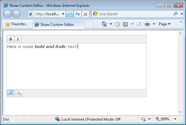 You customize the toolbar buttons by deriving a new HTML Editor from the base Editor class. For example, the custom editor in Listing 2 only contains toolbar buttons for bold and italic. All other toolbar buttons have been removed. Furthermore, the HTML tab has been removed from the bottom of the editor (but the Design and Preview tabs are still there).
