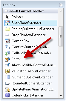 The HTML Editor control is located in the toolbox with the rest of the AJAX Control Toolkit controls. It is named the Editor control (see Figure 3).