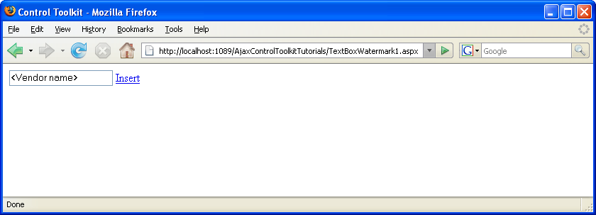 Now when the user changes into the insert mode of the FormView control, the text field for the new vendor is prefilled thanks to the TextBoxWatermarkExtender control. A click inside the textbox lets the filler text disappear.