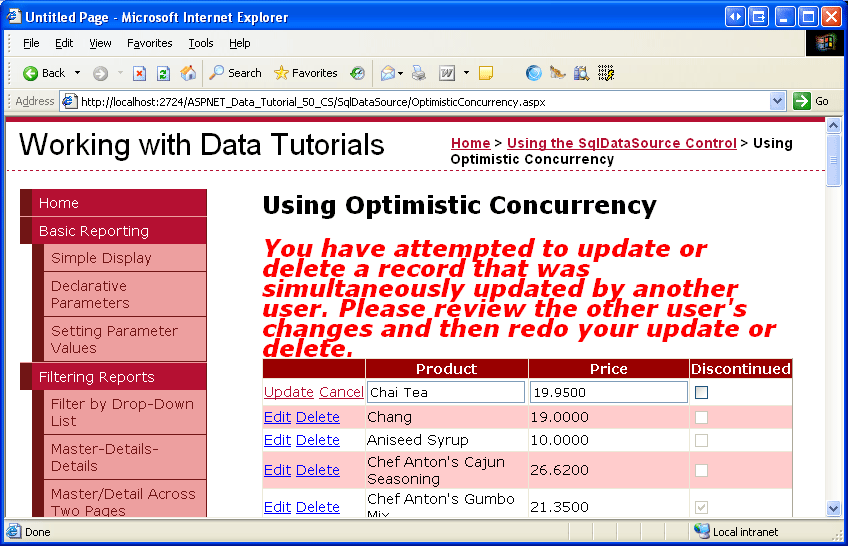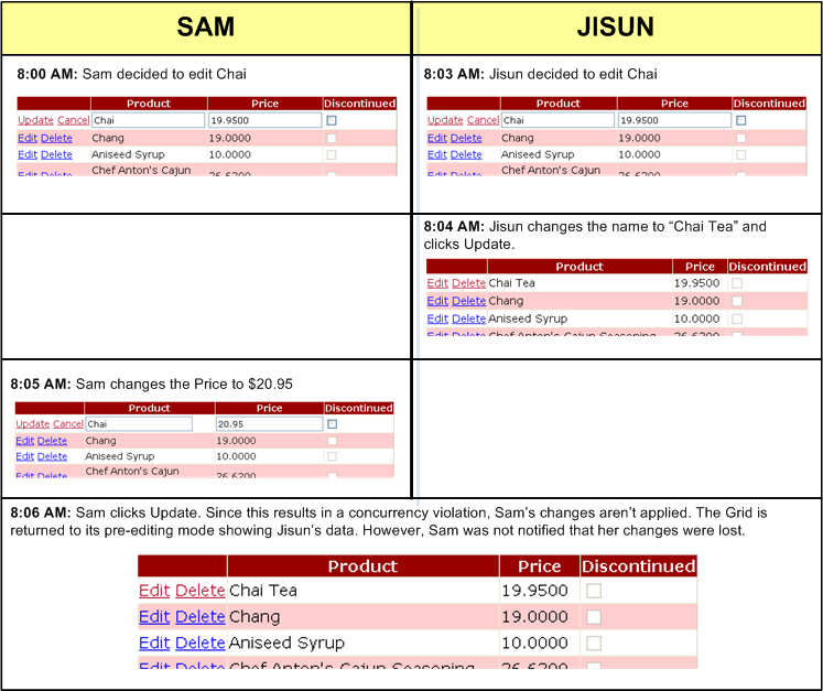 In the second browser window, change the price (but leave the product name as its original value) and click Update. On postback, the grid returns to its pre-editing mode, but the change to the price is not recorded. The second browser shows the same value as the first one the new product name with the old price. The changes made in the second browser window were lost. Moreover, the changes were lost rather quietly, as there was no exception or message indicating that a concurrency violation just occurred.