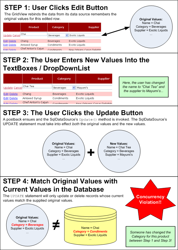 Optimistic concurrency control works by ensuring that the record being updated or deleted has the same values as it did when the updating or deleting process started. For example, when clicking the Edit button in an editable GridView, the record s values are read from the database and displayed in TextBoxes and other Web controls. These original values are saved by the GridView. Later, after the user makes her changes and clicks the Update button, the UPDATE statement used must take into account the original values plus the new values and only update the underlying database record if the original values that the user started editing are identical to the values still in the database. Figure 3 depicts this sequence of events.