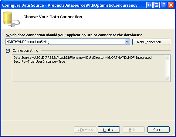 Start by opening the OptimisticConcurrency.aspx page from the SqlDataSource folder. Drag a SqlDataSource control from the Toolbox onto the Designer, settings its ID property to ProductsDataSourceWithOptimisticConcurrency. Next, click on the Configure Data Source link from the control s smart tag. From the first screen in the wizard, choose to work with the NORTHWINDConnectionString and click Next.