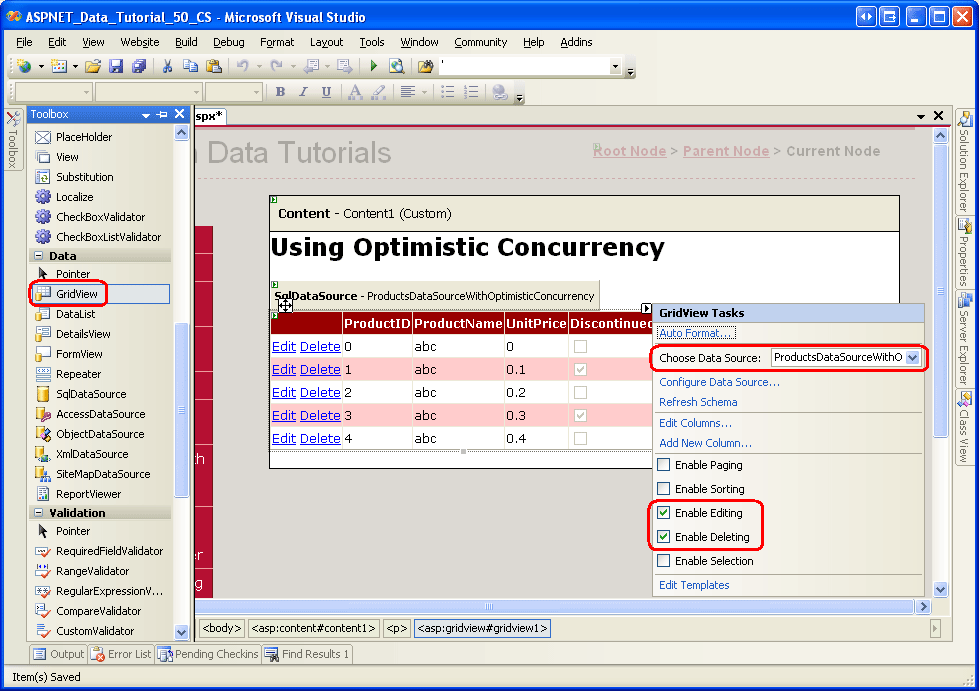 1: <asp:SqlDataSource ID="ProductsDataSourceWithOptimisticConcurrency"