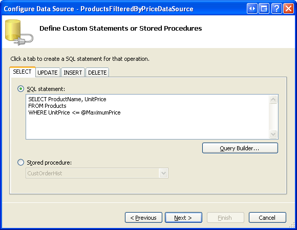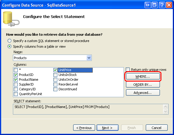 After adding the parameter, click OK to return to the Configure Data Source wizard. The SELECT statement at the bottom of the wizard should now include a WHERE clause with a parameter named @UnitPrice:
