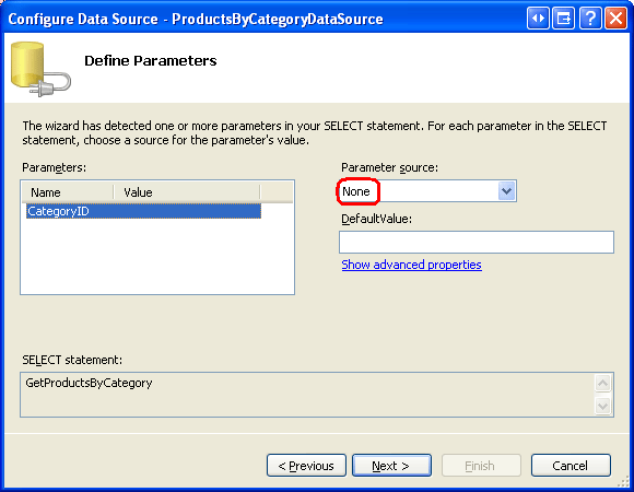 Since the stored procedure accepts an input parameter (@CategoryID), clicking Next prompts us to specify the source for this parameter s value. The Beverages CategoryID is 1, so leave the Parameter source drop-down list at None and enter 1 into the DefaultValue textbox.