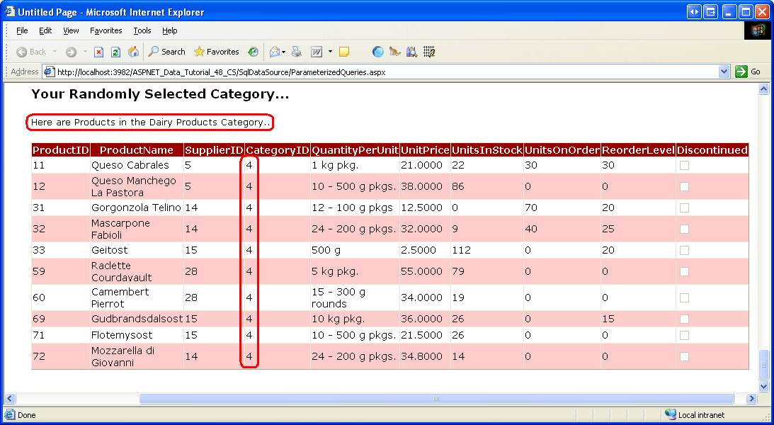 All of the examples we ve seen so far in this tutorial have used either a hard-coded parameter value or one taken from one of the pre-defined parameter sources (a querystring value, a Web control on the page, and so on). However, the SqlDataSource control s parameters can also be set programmatically. To complete our current example, we need a SqlDataSource that returns all of the products belonging to a specified category. This SqlDataSource will have a CategoryID parameter whose value needs to be set based on the CategoryID column value returned by the RandomCategoryDataSource SqlDataSource in the Page_Load event handler.