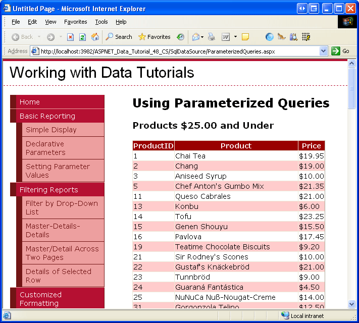 When the SqlDataSource s Select() method is invoked, the UnitPrice parameter value (25.00) is applied to the @UnitPrice parameter in the SelectCommand before being sent to the database. The net result is that only those products less than or equal to $25.00 are returned from the Products table. To confirm this, add a GridView to the page, bind it to this data source, and then view the page through a browser. You should only see those products listed that are less than or equal to $25.00, as Figure 3 confirms.