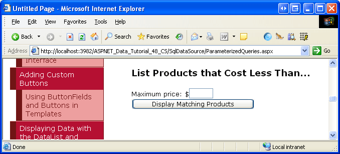 Enter a value into the textbox, like 5.00, and click the Display Matching Products button. On postback, the SqlDataSource informs the GridView that one of its parameter sources has changed. Consequently, the GridView rebinds to the SqlDataSource, displaying those products less than or equal to $5.00.