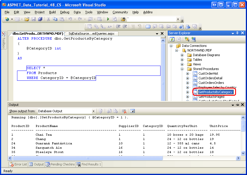 To illustrate using stored procedures in the SqlDataSource, let s create a new stored procedure in the Northwind database named GetProductsByCategory, which accepts a parameter named @CategoryID and returns all of the columns of the products whose CategoryID column matches @CategoryID. To create a stored procedure, go to the Server Explorer and drill down into the NORTHWND.MDF database. (If you don t see the Server Explorer, bring it up by going to the View menu and selecting the Server Explorer option.)