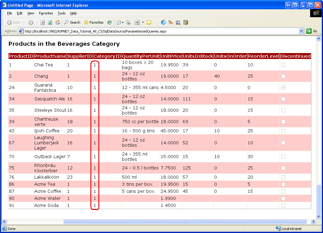 Test out the page in a browser. Only those products that belong to the Beverages category are displayed, although all of the product fields are displayed since the GetProductsByCategory stored procedure returns all of the columns from the Products table. We could, of course, limit or customize the fields displayed in the GridView from the GridView s Edit Columns dialog box.