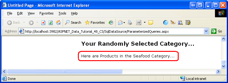 randomCategoryView(0) returns the first DataRowView in the DataView. randomCategoryView(0)("CategoryName") returns the value of the CategoryName column in this first row. Note that the DataView is loosely-typed. To reference a particular column value we need to pass in the name of the column as a string ( CategoryName, in this case). Figure 13 shows the message displayed in the CategoryNameLabel when viewing the page. Of course, the actual category name displayed is randomly selected by the RandomCategoryDataSource SqlDataSource on each visit to the page (including postbacks).