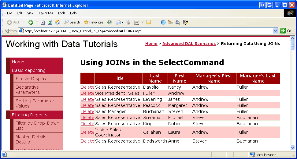 For this tutorial we will add a TableAdapter and strongly-typed DataTable for the Employees table in the NorthwindWithSprocs DataSet. The Employees table contains a ReportsTo field that specified the EmployeeID of the employee s manager. For example, employee Anne Dodsworth has a ReportTo value of 5, which is the EmployeeID of Steven Buchanan. Consequently, Anne reports to Steven, her manager. Along with reporting each employee s ReportsTo value, we might also want to retrieve the name of their manager. This can be accomplished using a JOIN. But using a JOIN when initially creating the TableAdapter precludes the wizard from automatically generating the corresponding insert, update, and delete capabilities. Therefore, we will start by creating a TableAdapter whose main query does not contain any JOIN s. Then, in Step 2, we will update the main query stored procedure to retrieve the manager s name via a JOIN.