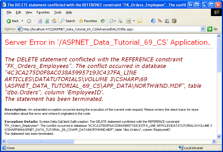 Clicking the Delete button starts the deleting workflow, which culminates in the execution of the Employees_Delete stored procedure. However, the attempted DELETE statement in the stored procedure fails because of a foreign key constraint violation (see Figure 15). Specifically, each employee has one or more records in the Orders table, causing the delete to fail.