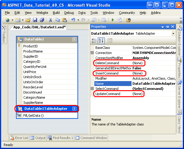 While the DataTable has the appropriate columns, the TableAdapter lacks values for its InsertCommand, UpdateCommand, and DeleteCommand properties. To confirm this, click on the TableAdapter in the Designer and then go to the Properties window. There you will see that the InsertCommand, UpdateCommand, and DeleteCommand properties are set to (None) .