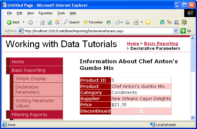 For this tutorial let’s start by illustrating how to use a parameter set to a hard-coded value. Specifically, we’ll look at adding a DetailsView to the page that displays information about a specific product, namely Chef Anton’s Gumbo Mix, which has a ProductID of 5. Next, we’ll see how to set the parameter value based on a Web control. In particular, we’ll use a TextBox to let the user type in a country, after which they can click a Button to see the list of suppliers that reside in that country.