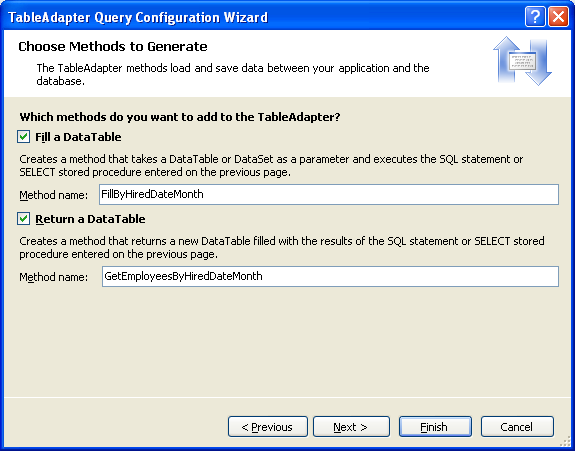 Finally, change the FillBy and GetDataBy method names to FillByHiredDateMonth and GetEmployeesByHiredDateMonth, respectively.