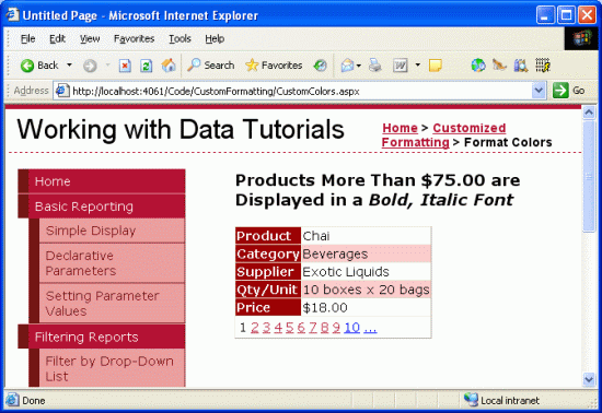 In many scenarios though, the formatting requirements depend upon the value of the displayed data. For example, to draw attention to out of stock products, a report listing product information might set the background color to yellow for those products whose UnitsInStock and UnitsOnOrder fields are both equal to 0. To highlight the more expensive products, we may want to display the prices of those products costing more than $75.00 in a bold font.