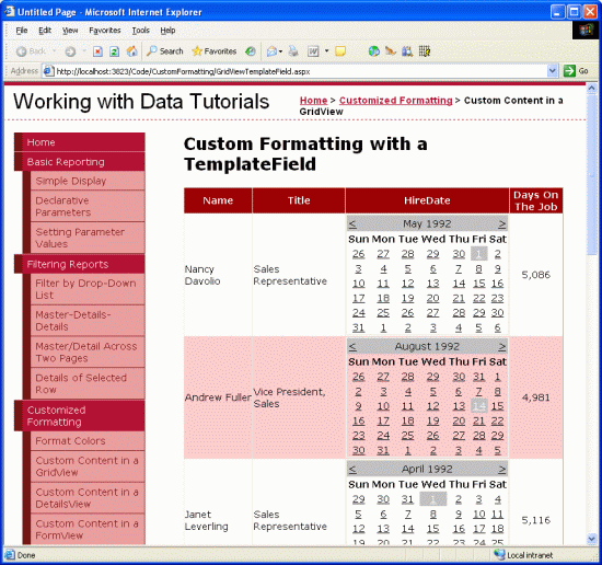 For this tutorial we will use TemplateFields to customize the appearance of a list of employees. Specifically, we’ll list all of the employees, but will display the employee’s first and last names in one column, their hire date in a Calendar control, and a status column that indicates how many days they’ve been employed at the company.
