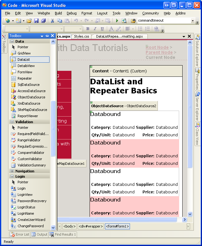 Step 1: Adding the DataList and Repeater Tutorial Web Pages