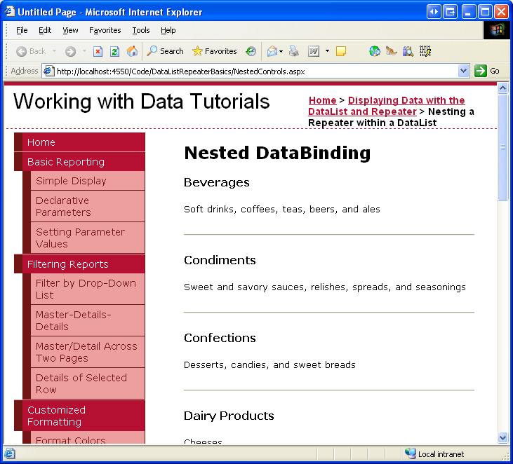 When building a page that uses nested data Web controls, I find it helpful to design, create, and test the outermost data Web control first, without even worrying about the inner nested control. Therefore, let s start by walking through the steps necessary to add a Repeater to the page that lists the name and description for each category.