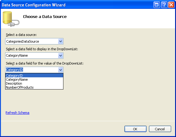 1: <asp:DropDownList ID="Categories" DataSourceID="CategoriesDataSource"
