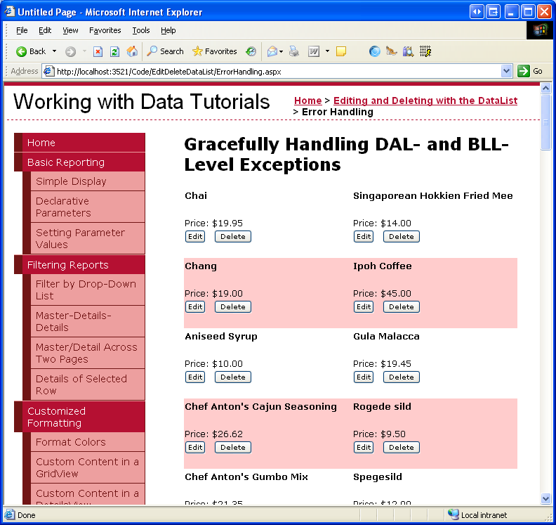 In the Overview of Editing and Deleting Data in the DataList tutorial, we created a DataList that offered simple editing and deleting capabilities. While fully functional, it was hardly user-friendly, as any error that occurred during the editing or deleting process resulted in an unhandled exception. For example, omitting the product s name or, when editing a product, entering a price value of Very affordable!, throws an exception. Since this exception is not caught in code, it bubbles up to the ASP.NET runtime, which then displays the exception s details in the web page.