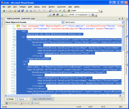 DataModificationEvents.aspxpage in Visual Studio - Go to the page’s declarative markup (click on the Source button at the bottom of the page)