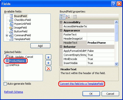 To add validation controls to the editing and inserting interfaces, the BoundFields used by the DetailsView and GridView controls need to be converted into TemplateFields. To achieve this, click on the Edit Columns and Edit Fields links in the GridView and DetailsView’s smart tags, respectively. There, select each of the BoundFields and click the “Convert this field into a TemplateField” link.
