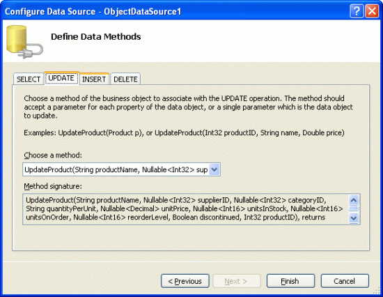 The DataObjectMethodAttribute attribute indicates the purpose of each method whether it is for selecting, inserting, updating, or deleting and whether or not it’s the default value. If you omitted these attributes when creating your BLL classes, you’ll need to manually select the methods from the UPDATE, INSERT, and DELETE tabs.