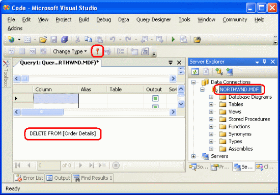 Let’s just delete all of the records from the Order Details table to circumvent the foreign key constraint. Go to the Server Explorer in Visual Studio, right-click on the NORTHWND.MDF node, and choose New Query. Then, in the query window, run the following SQL statement: DELETE FROM [Order Details]