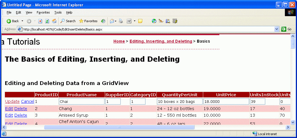 UnitPrice, when updating the data the GridView would not set theUnitPriceUpdateParametersvalue, which would change the database record’sUnitPriceto aNULLvalue. Similarly, if a required field, such asProductName, is removed from the GridView, the update will fail with the same “Column ‘ProductName’ does not allow nulls” exception mentioned above. - The editing interface formatting leaves a lot to be desired. The