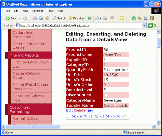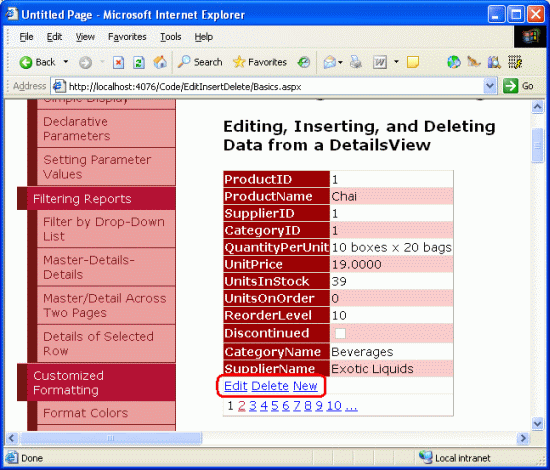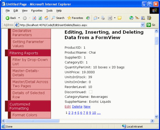 1: <asp:FormView ID="FormView1" runat="server" DataKeyNames="ProductID" DataSourceID="ObjectDataSource1" AllowPaging="True"> <EditItemTemplate> ... </EditItemTemplate> <InsertItemTemplate> ... </InsertItemTemplate> <ItemTemplate> ProductID: <asp:Label ID="ProductIDLabel" runat="server" Text='<%# Eval("ProductID") %>'></asp:Label><br /> ProductName: <asp:Label ID="ProductNameLabel" runat="server" Text='<%# Bind("ProductName") %>'> </asp:Label><br /> SupplierID: <asp:Label ID="SupplierIDLabel" runat="server" Text='<%# Bind("SupplierID") %>'> </asp:Label><br /> CategoryID: <asp:Label ID="CategoryIDLabel" runat="server" Text='<%# Bind("CategoryID") %>'> </asp:Label><br /> QuantityPerUnit: <asp:Label ID="QuantityPerUnitLabel" runat="server" Text='<%# Bind("QuantityPerUnit") %>'> </asp:Label><br /> UnitPrice: <asp:Label ID="UnitPriceLabel" runat="server" Text='<%# Bind("UnitPrice") %>'></asp:Label><br /> UnitsInStock: <asp:Label ID="UnitsInStockLabel" runat="server" Text='<%# Bind("UnitsInStock") %>'> </asp:Label><br /> UnitsOnOrder: <asp:Label ID="UnitsOnOrderLabel" runat="server" Text='<%# Bind("UnitsOnOrder") %>'> </asp:Label><br /> ReorderLevel: <asp:Label ID="ReorderLevelLabel" runat="server" Text='<%# Bind("ReorderLevel") %>'> </asp:Label><br /> Discontinued: <asp:CheckBox ID="DiscontinuedCheckBox" runat="server" Checked='<%# Bind("Discontinued") %>' Enabled="false" /><br /> CategoryName: <asp:Label ID="CategoryNameLabel" runat="server" Text='<%# Bind("CategoryName") %>'> </asp:Label><br /> SupplierName: <asp:Label ID="SupplierNameLabel" runat="server" Text='<%# Bind("SupplierName") %>'> </asp:Label><br /> <asp:LinkButton ID="EditButton" runat="server" CausesValidation="False" CommandName="Edit" Text="Edit"> </asp:LinkButton> <asp:LinkButton ID="DeleteButton" runat="server" CausesValidation="False" CommandName="Delete" Text="Delete"> </asp:LinkButton> <asp:LinkButton ID="NewButton" runat="server" CausesValidation="False" CommandName="New" Text="New"> </asp:LinkButton> </ItemTemplate> </asp:FormView>