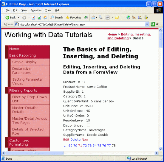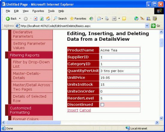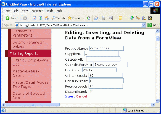 Figure 24 shows the FormView in a browser when adding a new product, Acme Coffee. Note that the SupplierName and CategoryName fields shown in the ItemTemplate are no longer present, as we just removed them. When the Insert button is clicked the FormView proceeds through the same sequence of steps as the DetailsView control, adding a new record to the Products table. Figure 25 shows Acme Coffee product’s details in the FormView after it has been inserted.