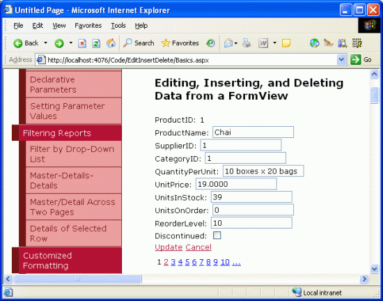 Figure 23 shows the FormView in a browser after the Edit button has been clicked for Chai. Note that the SupplierName and CategoryName fields shown in the ItemTemplate are no longer present, as we just removed them from the EditItemTemplate. When the Update button is clicked the FormView proceeds through the same sequence of steps as the GridView and DetailsView controls.